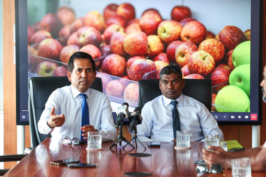 އެސްޓީއޯއިން މިއަދު ބޭއްވި ނޫސްވެރިންގެ ބައްދަލުވުމުގައި އިކޮނޮމިކް މިނިސްޓަރު ސައީދާއި އެސްޓީއޯ އެމްޑީ ޝިމާދު: ސައީދު ވިދާޅުވީ، އެސްޓީއޯއިން މޭވާއާއި ތަރުކާރީ ބާޒާރަށް ނެރުނަސް ކުދި ވިޔަފާރިތަކަށް އަސަރެއް ނުކުރާނެ ކަމަށް --- ސަން ފޮޓޯ/ މާނިއު މުހައްމަދު