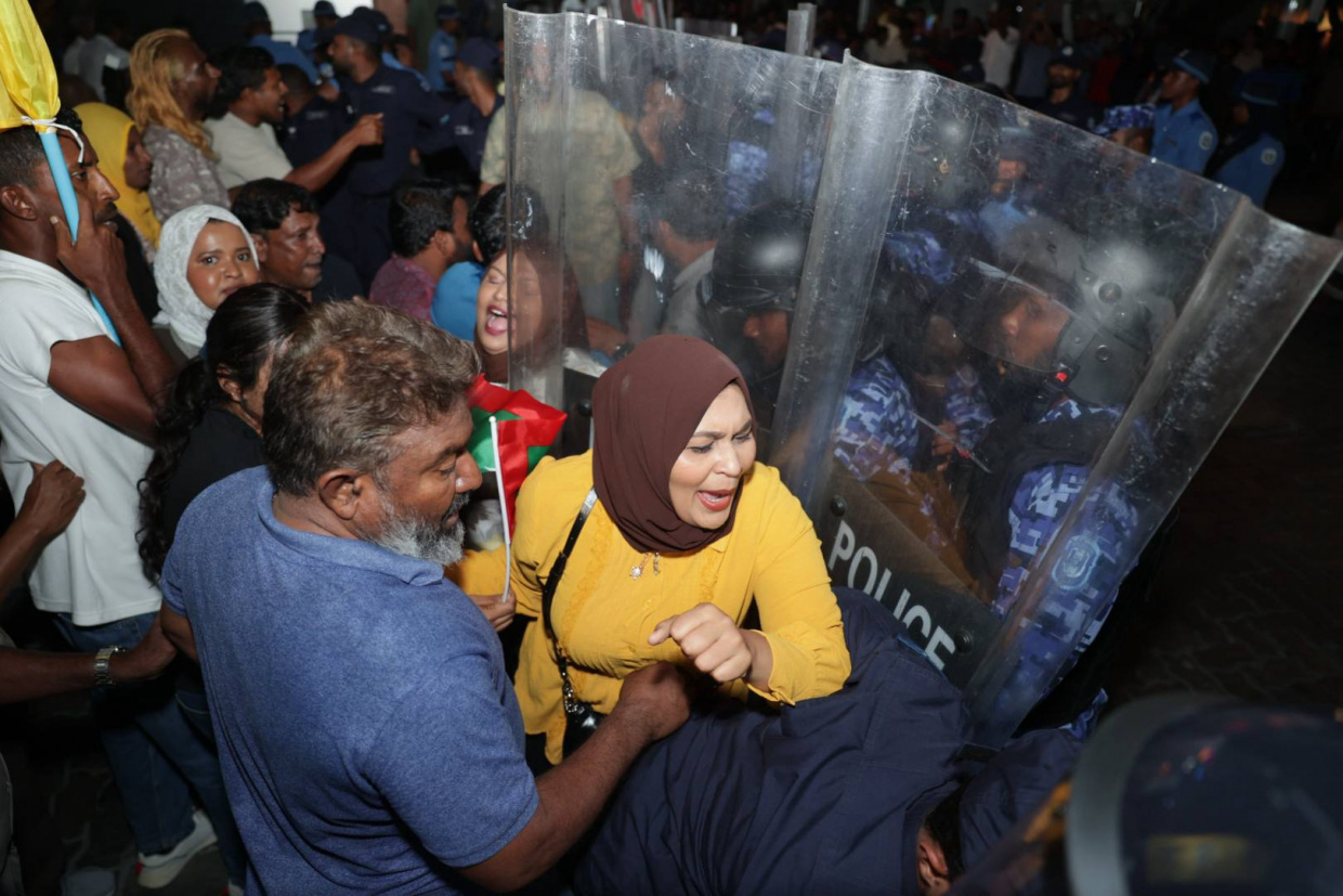 ފުލުހުންގެ ޗިޓުގައިވާ ގޮތުން އެ ތިން މީހުން ވެސް ފުލުހަށް ހާޒިރުވާން އެންގީ، ގާނޫނާ ޚިލާފަށް މާލޭގެ އެކި ސަރަހައްދުގެ މަގުތަކަށް އެއްވެ އަޑުގަދަކޮށް މުޒާހަރާކޮށް، އާންމު ދަތުރުފަތުރަށް ހުރަސް އެޅުމާއި، ވިޔަފާރިތަކަށް ދަތިވާނެހެން ހަރަކާތްތެރިވެ، ފުލުހުންގެ ދައުރު އަދައިކުރުމަށް ހުރަސް އަޅައި، ފުލުހުންގެ އަމުރަށް ނުކިޔަމަންތެރިވެ ވާޖިބަށް ހުރަސް އެޅިކަމަށް ތުހުމަތުކޮށް ތަހުގީގު ކުރާ މައްސަލައަކާ ގުޅިގެންނެވެ.
