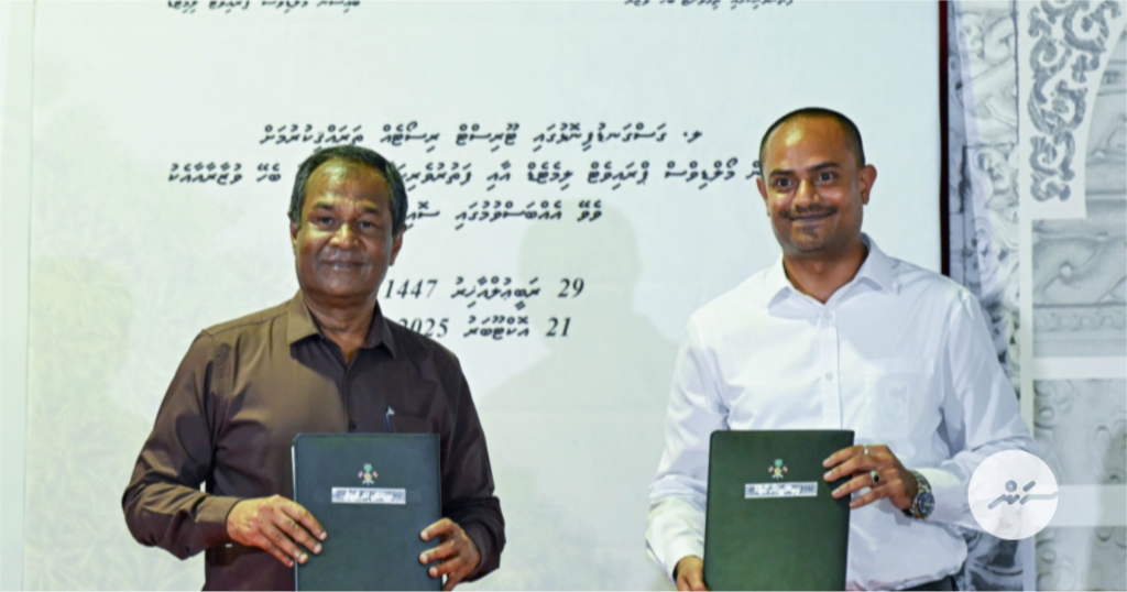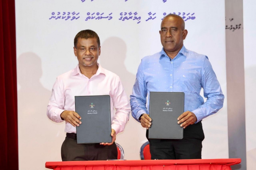 ހޮސްޕިޓަލް ޓާޝަރީ ފެންވަރަށް ތަރައްގީ ކުރުމުގެ އެއްބަސްވުމުގައި ސޮއިކުރެއްވީ، ހެލްތު މިނިސްޓަރު އަބްދުﷲ ނާޒިމް އިބްރާހީމާއި އެމްޓީސީސީގެ މެނޭޖިން ޑިރެކްޓަރު އަހުމަދު ސައުދީއެވެ.