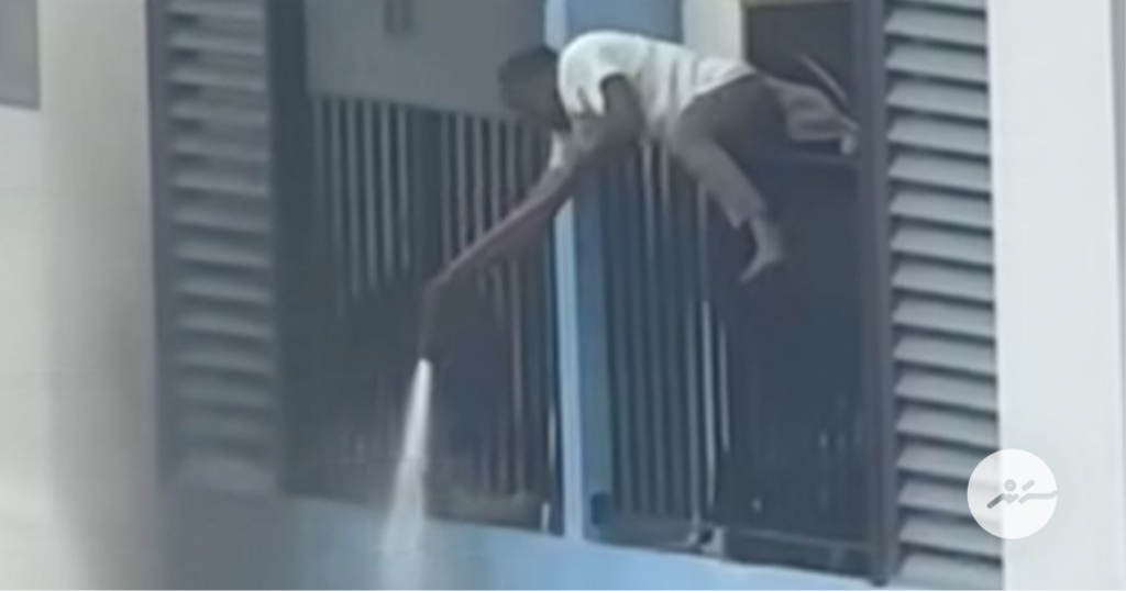 ސޯޝަލް މީޑިއާގައި ދައުރުވަމުން އަންނަ ވީޑިއޯއަކުން، އަލިފާން ހިފާފައިވާ ބެލްކަންޏަށް، މަތީ ފަންގިފިލާއެއްގެ ބެލްކަނިން ފިރިހެނަކު ފެން ޖަހާ މަންޒަރު ފެނެއެވެ. ފެންހޮޅިއަކުން އޭނާ ފެން ޖަހަމުންދިޔައީ ބެލްކަނީ މައްޗަށް އެއް ފައި އަރުވައިގެން އޮވެއެވެ.