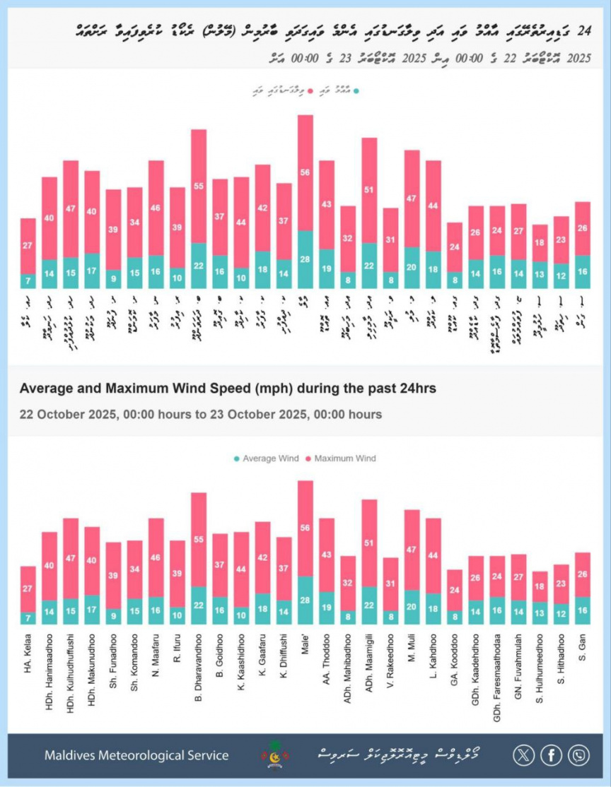 ފާއިތުވި 24 ގަޑިއިރަށް ބަލާފައި މެޓްއިން ނެރުނު ތަފާސްހިސާބުތަކަށް ބަލާއިރު އިއްޔެ އެންމެ ވައިބާރުވެފައިވަނީ މާލެއަށެވެ. އެ ތަފާސްހިސާބުން ދައްކާގޮތުގައި މާލެއަށް އެވްރެޖްކޮށް 28 މޭލުގެ ބާރުމިނަށް ވައިޖެހެއެވެ. އަދި، މާލެއަށް އެންމެ ބާރަށް 56 މޭލުގެ ބާރުމިނުގައި ވައިޖެހިފައިވާ ކަމަށް މެޓުން ރެކޯޑުކޮށްފައިވެއެވެ.