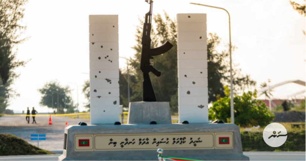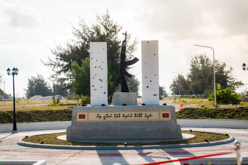 މިއަދު ހުޅުވި ހަނދާނީ ބިނާގައި ހުރީ، ޝަހީދު ހުސައިން ބޭނުންކުރެއްވި އޭކޭ-47 ބަޑީގެ ހަތް ފޫޓުގެ ނަކަލެކެވެ. އެ ބިނާ ބަހައްޓާފައި ހުރީ، ޝަހީދު ހުސައިން އާދަމް ކުޅުދުއްފުށިން އެންމެ ފަހުން ފުރާވަޑައިގެންނެވި ސަރަހައްދު ކަމަށްވާ، ކުރީގެ ބަނދަރު ސަރަހައްދުގައެވެ.